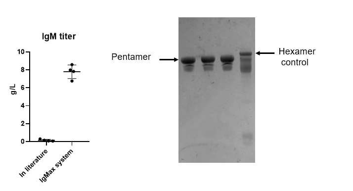 在細胞株構(gòu)建階段,漢騰生物研發(fā)團隊選擇了具有最高穩(wěn)定性和特定生產(chǎn)力的CHO細胞系作為最終的先導克隆,并且通過調(diào)節(jié)載體比例改變產(chǎn)生的抗體滴度。漢騰生物IgMaxTM表達載體平臺最高可以達到8g/L的產(chǎn)量,并且IgM構(gòu)型均一,其中,五聚體比例接近100%,幾乎無六聚體產(chǎn)生(IgM有五聚體和六聚體形式,包含開放J鏈的五聚體形式是開發(fā)和生產(chǎn)IgM的目標構(gòu)型)。