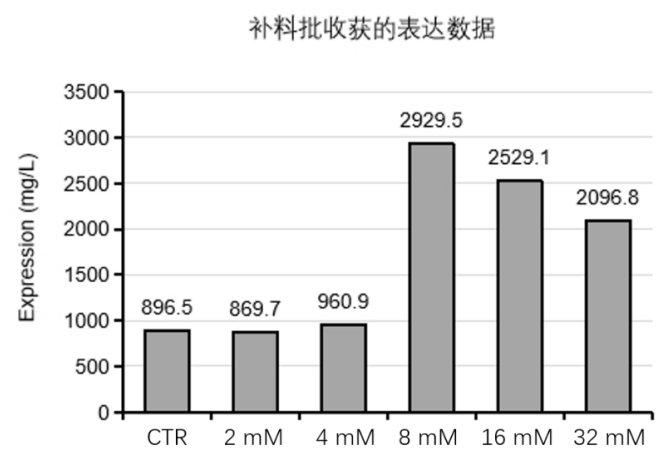 此前,并無高效表達(dá)人類神經(jīng)生長(zhǎng)因子(human never growth factor,hNGF)的培養(yǎng)方法,極大限制了 hNGF 的大規(guī)模生產(chǎn)和在臨床與藥物方面的應(yīng)用。漢騰生物采用補(bǔ)料分批培養(yǎng)方法,并發(fā)現(xiàn)了新的添加劑,可以將 hNGF 重組蛋白的表達(dá)量提高至少 100%,產(chǎn)量最高可提升至 2900 mg/L左右(圖 2),較大地提升了 hNGF 在 CHO 細(xì)胞中的表達(dá)水平(詳細(xì)內(nèi)容參考漢騰專利:重組神經(jīng)生長(zhǎng)因子的高效表達(dá)方法,CN2023108028220)。