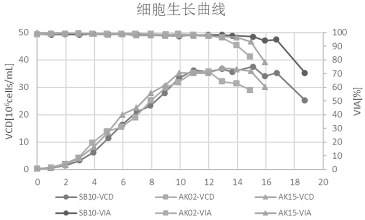 圖 3. 活細(xì)胞密度(VCD)和細(xì)胞活率(VIA)。SB-10:環(huán)軌搖晃式生物反應(yīng)器;AK02:3 L攪拌式生物反應(yīng)器;AK15:15 L攪拌式生物反應(yīng)器