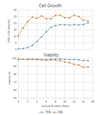 加強型補料培養(yǎng)(IFB)和常規(guī)補料培養(yǎng)(TFB)細胞生長及活率對比