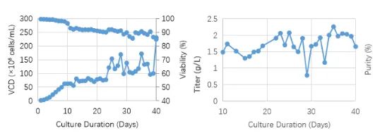 CHO細胞(表達單抗)40天灌流培養(yǎng)的細胞生產(chǎn)及活率