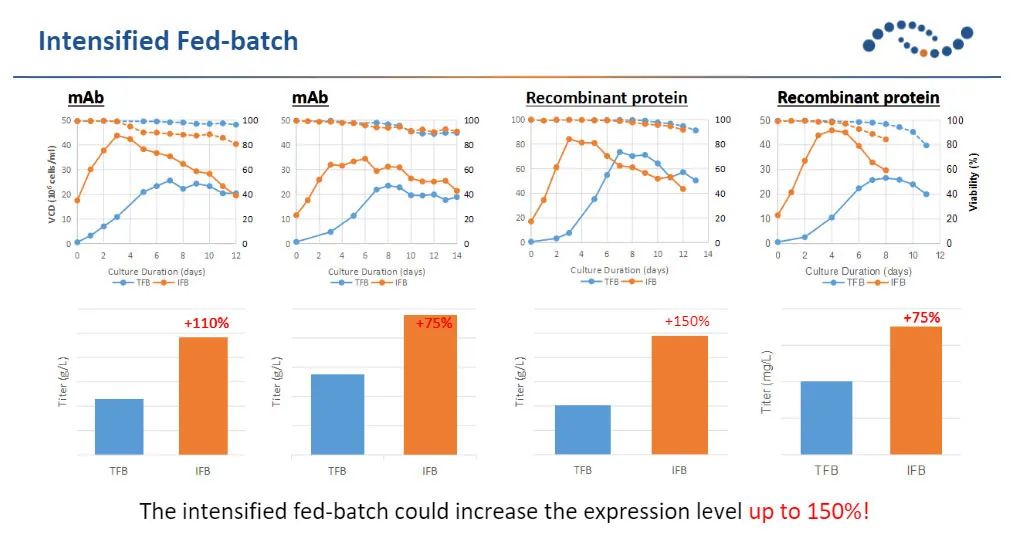 透過(guò)強(qiáng)化型的補(bǔ)料批培養(yǎng),并結(jié)合細(xì)胞生長(zhǎng)特性, 生長(zhǎng)代謝的監(jiān)控, 可以在與傳統(tǒng)的工藝方式相同的培養(yǎng)周期, 提高蛋白質(zhì)表達(dá)量超過(guò)70%。