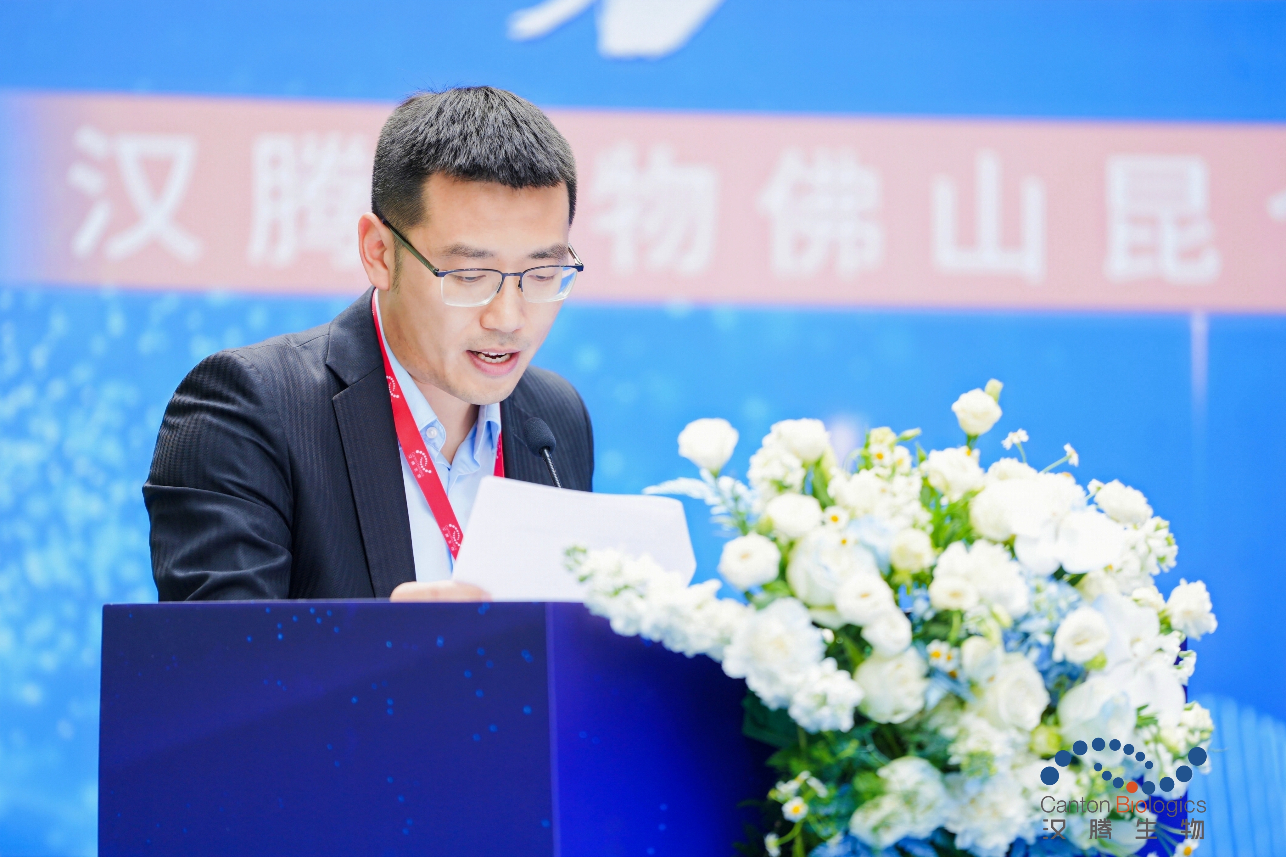 會(huì)議伊始,漢騰生物創(chuàng)始人CEO沈?yàn)t博士上臺(tái)致辭,他提出,漢騰生物自2016年成立以來(lái),便以“生物技術(shù)賦能未來(lái)”為使命,為全球生物藥及生物技術(shù)公司提供一站式服務(wù)。經(jīng)過(guò)多年的發(fā)展,漢騰生物已發(fā)展成粵港澳大灣區(qū)生物技術(shù)領(lǐng)域的佼佼者,在廣州、佛山、上海以及德國(guó)柏林等地建立了研發(fā)、生產(chǎn)運(yùn)營(yíng)和臨床供應(yīng)基地,以國(guó)際化運(yùn)營(yíng)的姿態(tài),為全球合作伙伴提供專業(yè)、高效的服務(wù)方案。