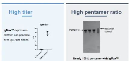 IgM類抗體一般呈五聚體結(jié)構(gòu),分子量大,糖基化位點多,結(jié)構(gòu)復(fù)雜,單克隆細(xì)胞株構(gòu)建和工藝開發(fā)難度大。漢騰生物團(tuán)隊在前期的細(xì)胞株構(gòu)建階段,結(jié)合IgM平臺專有載體系統(tǒng)篩選優(yōu)化獲得了高產(chǎn)細(xì)胞株,產(chǎn)生的五聚體比例可高達(dá)100%,幾乎無六聚體產(chǎn)生,減少工藝開發(fā)難度。